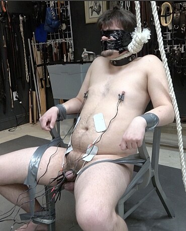 Tuffdude MarylandMasoBoy is tied to the seatless chair in the dungeon by his Master Extremetop for what, Sir promised to be an intense session of electro entertainment for Master. Master uses duct-tape to bind the boy’s meaty, naked body to the chair, exposing his crotch area and torso. The boy is not only wired up with conductive tubes, but he also lined with tens-unit pads on his abs. As a final touch, Master attaches a pair of bipolar tit-clamps to the boy’s nipples. Those most tender areas of his body will not be left untouched. Little by little master begins to build the electric current as Master enjoys,] watching the boy squirm and squeal. And as the E-stim unit approaches it halfway-mark, which is amazingly intense, Master gives the boy the option of raising one finger when he is close to having enough. It takes a while, but eventually, the finger rises but Sir urges the boy onto suffer for one more minute. The amazing maso-boy gladly complies offers and serves his Sir to his max.