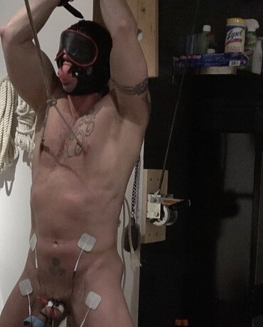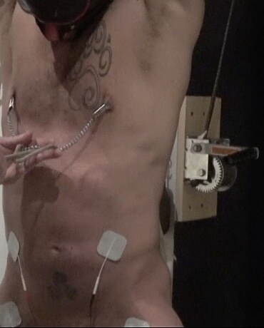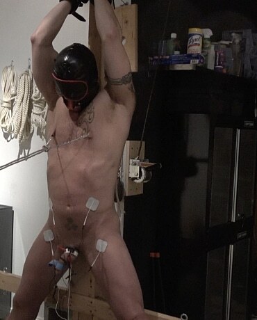 Master Extremetop decides that he wants some entertainment as he jerks off, and MLDSLC is very happy to provide it. Soon the muscle stud is bound up to the upright post of Sir’s Roman cross. He then meticulously lines the boy’s crotch and abs with tens unit pads. He also puts conductive bands around the boy’s massive dick and just add a little interest to the whole scene, he then attaches a pair of tit clamps to the muscle stud’s nipples. He attaches a rope to the chain of the tit clamps and dangles a 5-pound weight from it. For the next half hour or so, Extremetop increases the current to the pads and bands. But as he gets more excited, he wants more. And so he wires the boy up to a crank magneto and watches the stud jump and squirm with each turn of the magneto’s crank. t doesn’t take much longer after that tfor Master o shoot his load! The muscle stud provided great orgasmic entertainment to his, Sir