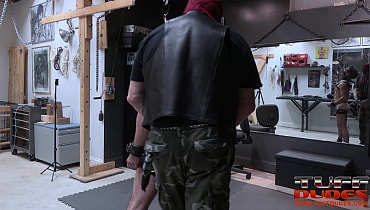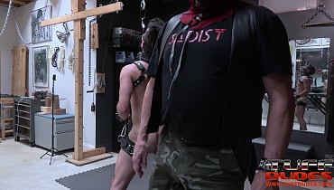 Riley Ross gets put to the test today in his dungeon. Hands shackled to his thigh straps, and head held up high by a humiliator gag Riley is once again fully exposed to be put to use for his Sir. The boy is man handled, groped, and prodded to start, getting him in the proper sub headspace. Riley is reminded he there for one purpose: to serve in what ever way Extremetop wants. The boy’s nipples are clamped to sensitize them for what’s to come. Extremetop warms up his sub’s body with his buggywhip before moving on to the main event.