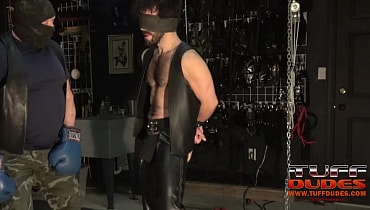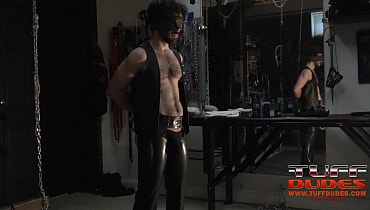 Leatherboy Riley Ross finds himself trussed up in his Sir Extremetop’s dungeon since Sir wants to use him as a punching bag for the evening. They boy’s muscular frame takes the beating well, so well in fact that Sir changes course and wants to see his boy shoot a load as a reward. Sir uncuffs the boy’s wrist and adds some lube to the boys’ beautiful hard cock. It’s been a while since the boy’s last orgasm, so it doesn’t take long for the explosion of cum to spurt all over the floor. Both men join in a warm embrace of mutual devotion….but then Sir binds up the boy again and leaves him in the darkens of the dungeon to spend the night. Pleasant dreams await both.