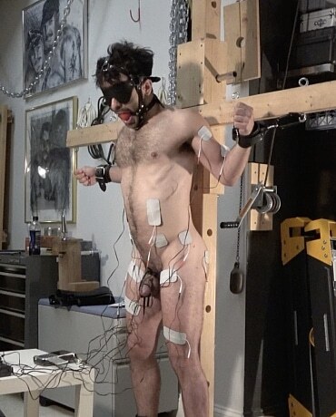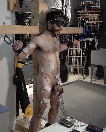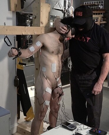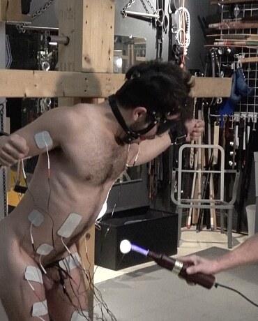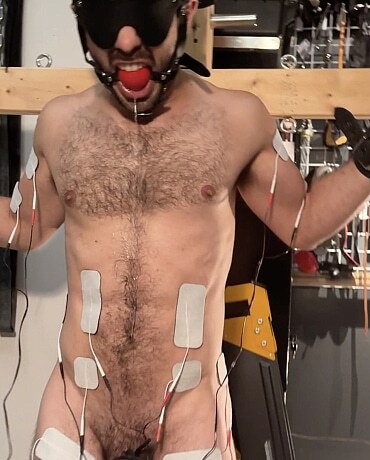 Wonderful. The more the electro is turned up the more you see him tremble and lean forward. The drool from behind the ball gag just adds to the spectacle. I was trying to spot the pairs of electrodes, one on each bicep, on the buttocks, on both thighs, obviously the cock and balls and two on the stomach. Have I missed any? That's a lot for him to concentrate on!