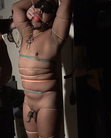 Torturedboy stands helplessly in his Master’s dungeon, gagged and blindfolded with his arms locked up beind his head. The slave can’t see but he can feel tight constrictions all over his smooth body. He squirms trying to understand his predicament as Extremetop admires his work. Tortureboy finds out quickly what is squeezing him as his Master begins pulling and snapping the rubber bands against his smooth skin. The pace picks up and Torturedboy is sent into a frenzy, snapping rubberbands sending jolts of pain and pleasure across his bound body. His slave succumbs and Extremetop relents, patting Torturedboy on the head as he moves to prepare the next session.