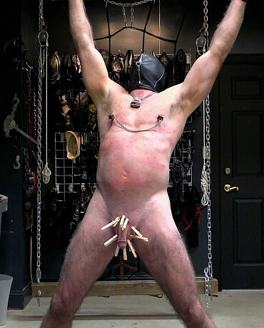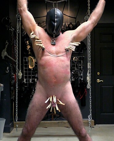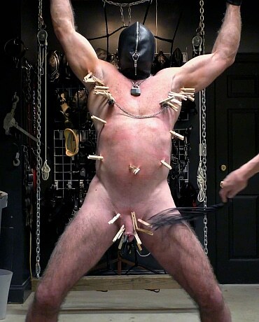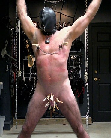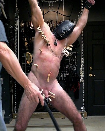 Our newest TuffDude is Westminsterboy, a hulking sub who is eager to please his new master Extremetop. In his first encounter, Westminsterboy is restrained wide open and hooded as Extremetop loads him up with clothespins. Heavy clover clamps are fastened to the boy’s nipples for extra comfort. Westminsterboy’s cock and balls are then covered entirely in pins as Extremetop moves to cover the rest of the sub’s large frame. Once adequately covered in pins, Extremetop begins the impact portion of his first encounter with Westminsterboy. Starting with a small but mean corded flogger, Extremetop takes several lashes at the boy’s balls. Westminsterboy starts turning bright red as lash after lash begins to knock the clothespins off him. Extremetop realizes this is getting a rise out of Westminsterboy, so he starts whipping off the remaining clothes pins sending the sub into waves of agony and extasy. The two share an embrace before their next encounter, which Westminsterboy requested to be a harsh electro scene… something Extremetop plans to make good on.