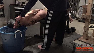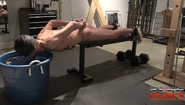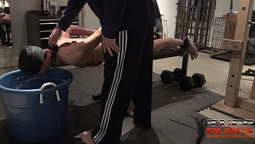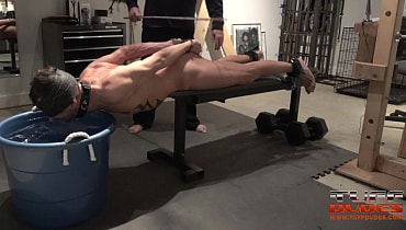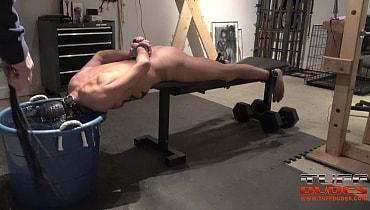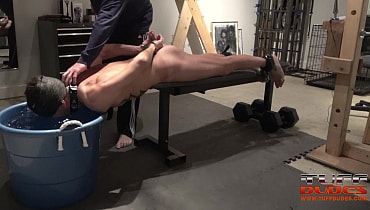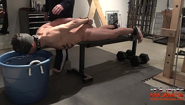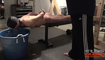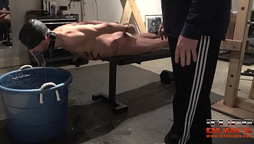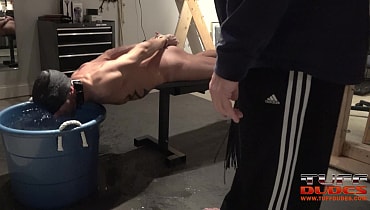 Extremetop’s long-time slave from Switzerland dares his Master to torture him till he taps out. His Master is up for the challenge and straps the slave to a bench face-down but pulled forward so that his entire torso from the groin up is hanging over the bench’s edge. Then much to the slave’s surprise, Master pulls over a deep tub of cold water right under the slave’s head. So begins round one with Master having a great time dunking the slave into the tub for longer an loner periods of time. Guess what? After about 7 minutes of struggling to breathe, the slave holds up 2 fingers signaling that he gives up. But Master is having too much fun, so he flips the slave over and the water torture begins again but this time the slave of face up. He offers up the information after 6 minutes. It’s the way Tuffdudes enjoy themselves!